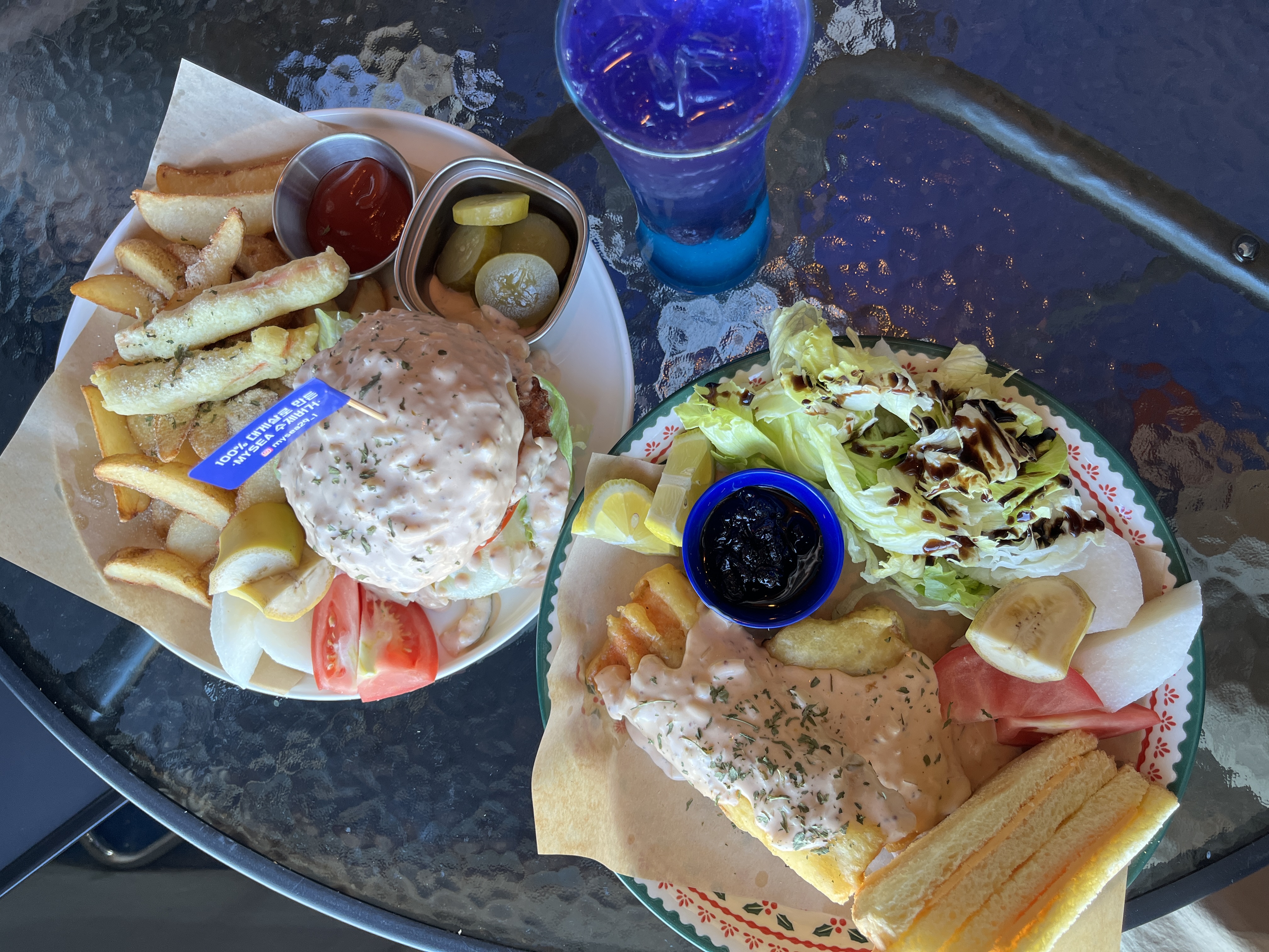 연어튀김과 햄버거 위에 뿌려진
